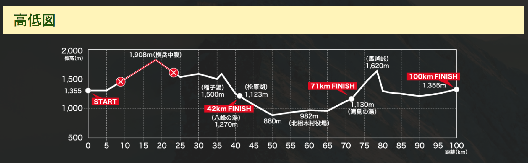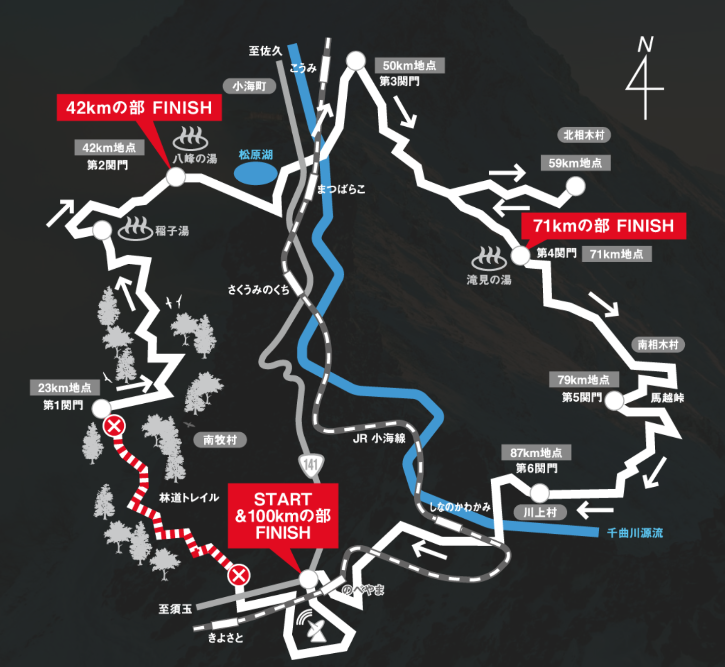 赛事的起点设南牧村社会体育館。42公里终点:八峰の湯,71公里终点:滝見の湯,100公里回到南牧村社会体育館。