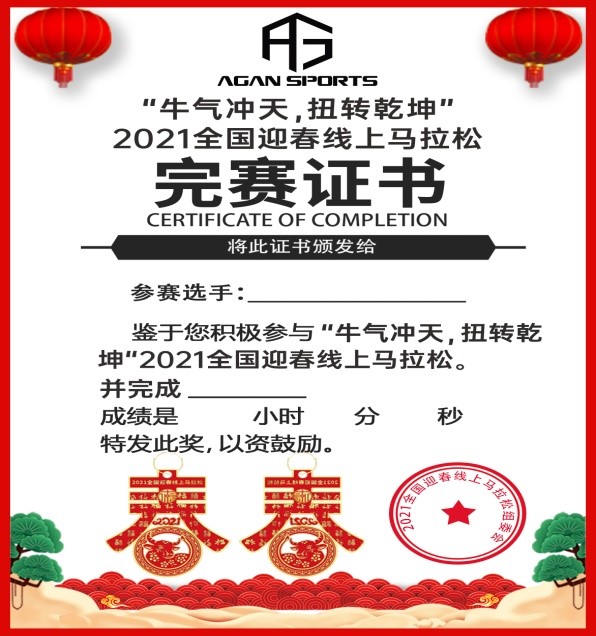 自行安排活动地点及路线,用任意跑步App记录或手表跑步拍照记录,在规定的时间内完赛并在比赛期间(2021年2月11日8:00:00-2月26日内)上传到公众号:Agan sports ,先关注并点开Agan sports,点开赛事服务,上传成绩,按住“牛气冲天,扭转乾坤”2021全国迎春线上马拉松二维码并扫描标题 下方二维码,填写要求内容即可完成上传。