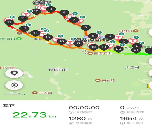 三峰22公里路线为大觉寺—妙峰古道—萝卜地—庙洼—阳台山—妙峰山—娘娘庙—涧沟村—萝卜地垭口—大觉寺。